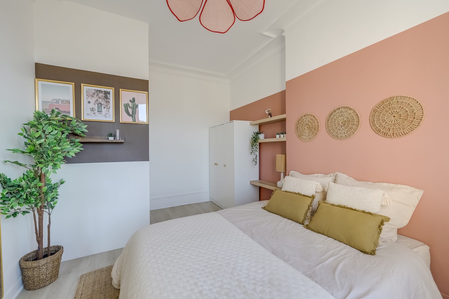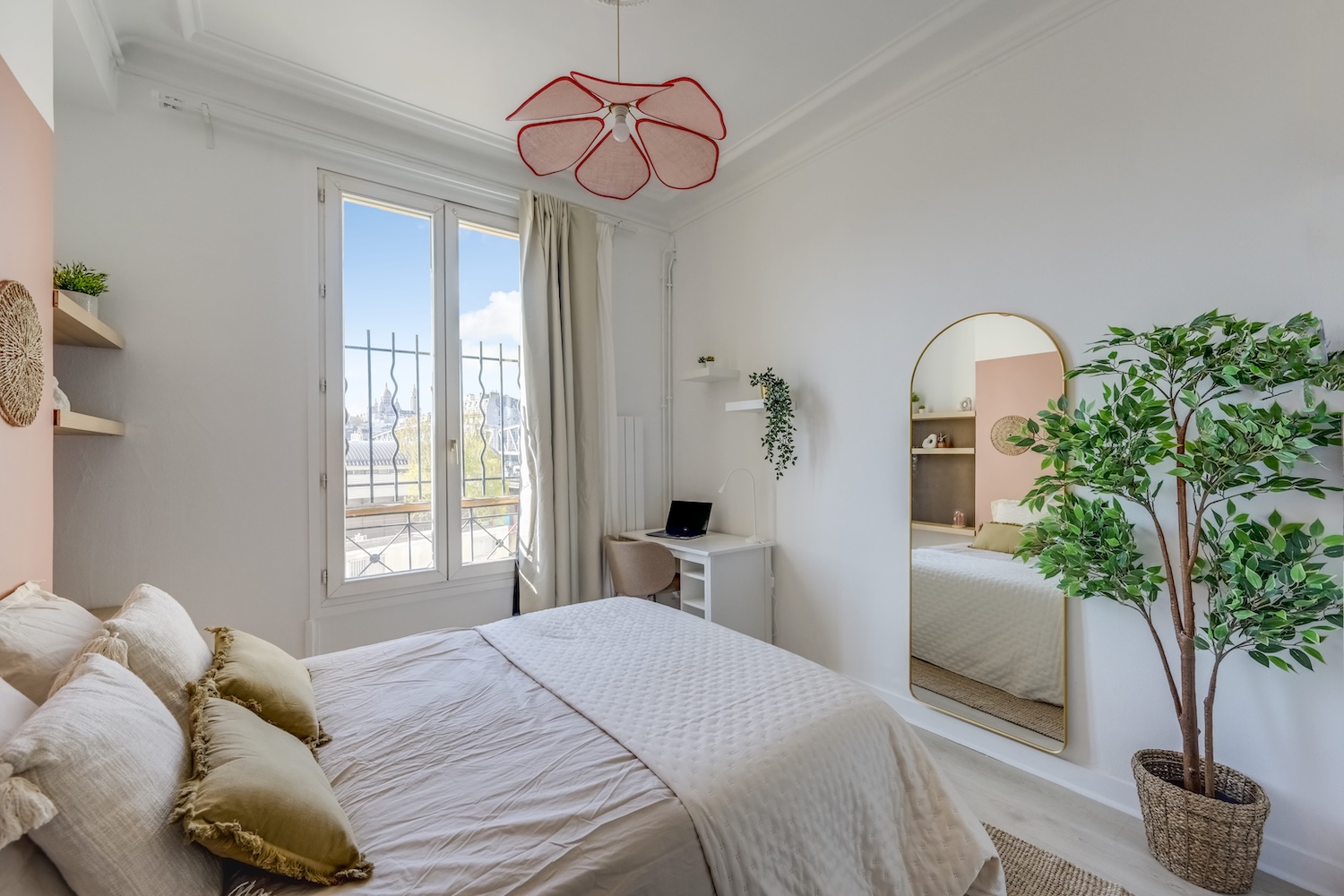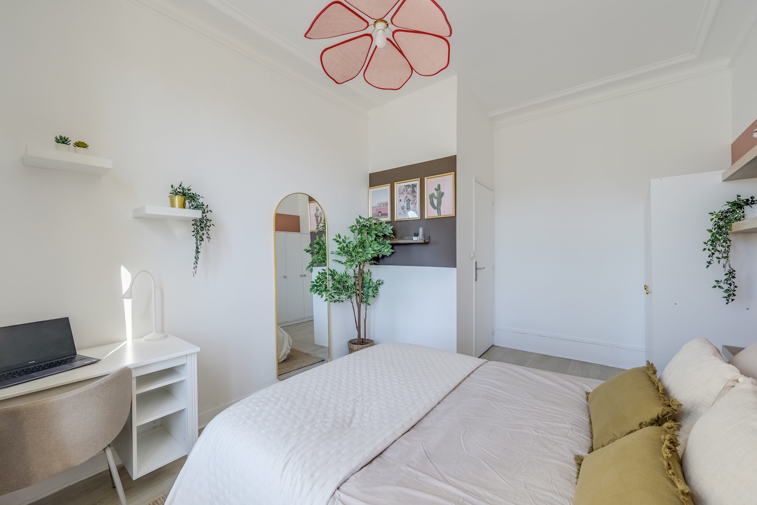 Fais de cette chambre de 12 m² ton nouveau chez-toi. Située dans le 10ème arrondissement de Paris, elle est louée meublée. Elle dispose d'un espace nuit avec lit double (140x190), d'un espace de travail et de rangements. Rénovée par nos architectes, la chambre joue sur un contraste romantiques et bohème, combinant des éléments beiges et roses.