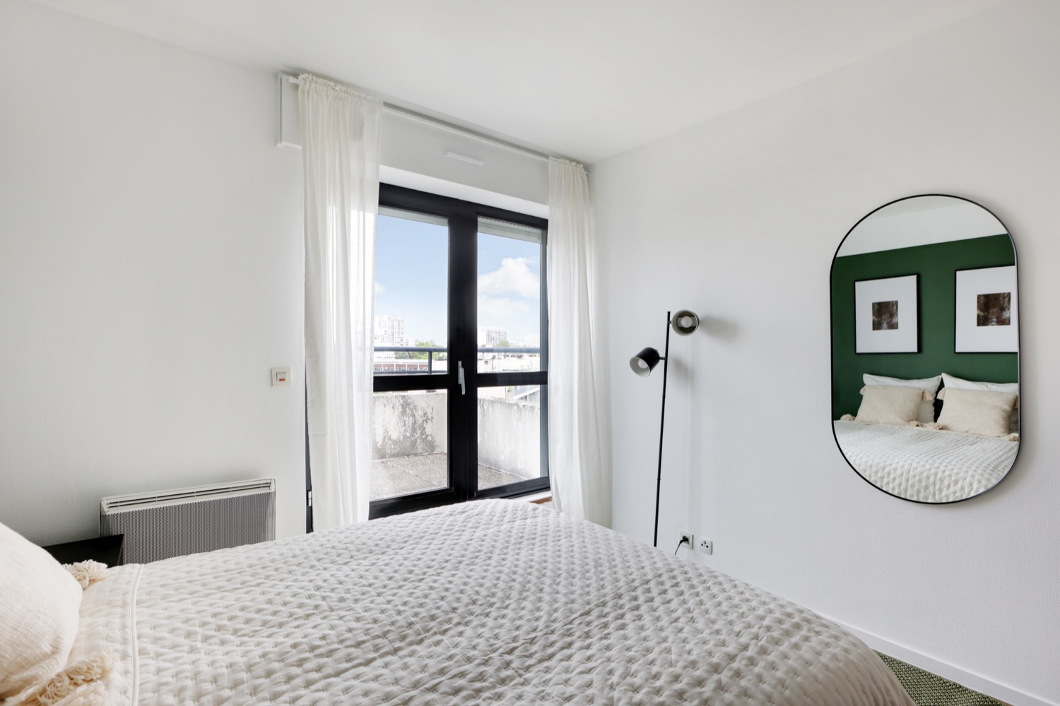 Nous t'accueillons dans cette chambre de 10 m², à Courbevoie, à seulement quelques kilomètres de Paris. Entièrement redécorée dans un style urbain par nos architectes, cette chambre, située à l'étage de l'appartement, comprend tout ce dont tu as besoin : un espace nuit avec lit double (140x200), un bureau, et une armoire pour y ranger tes affaires. Cerise sur le gâteau : tu as même ton propre balcon privatif pour profiter des belles soirées d'été.