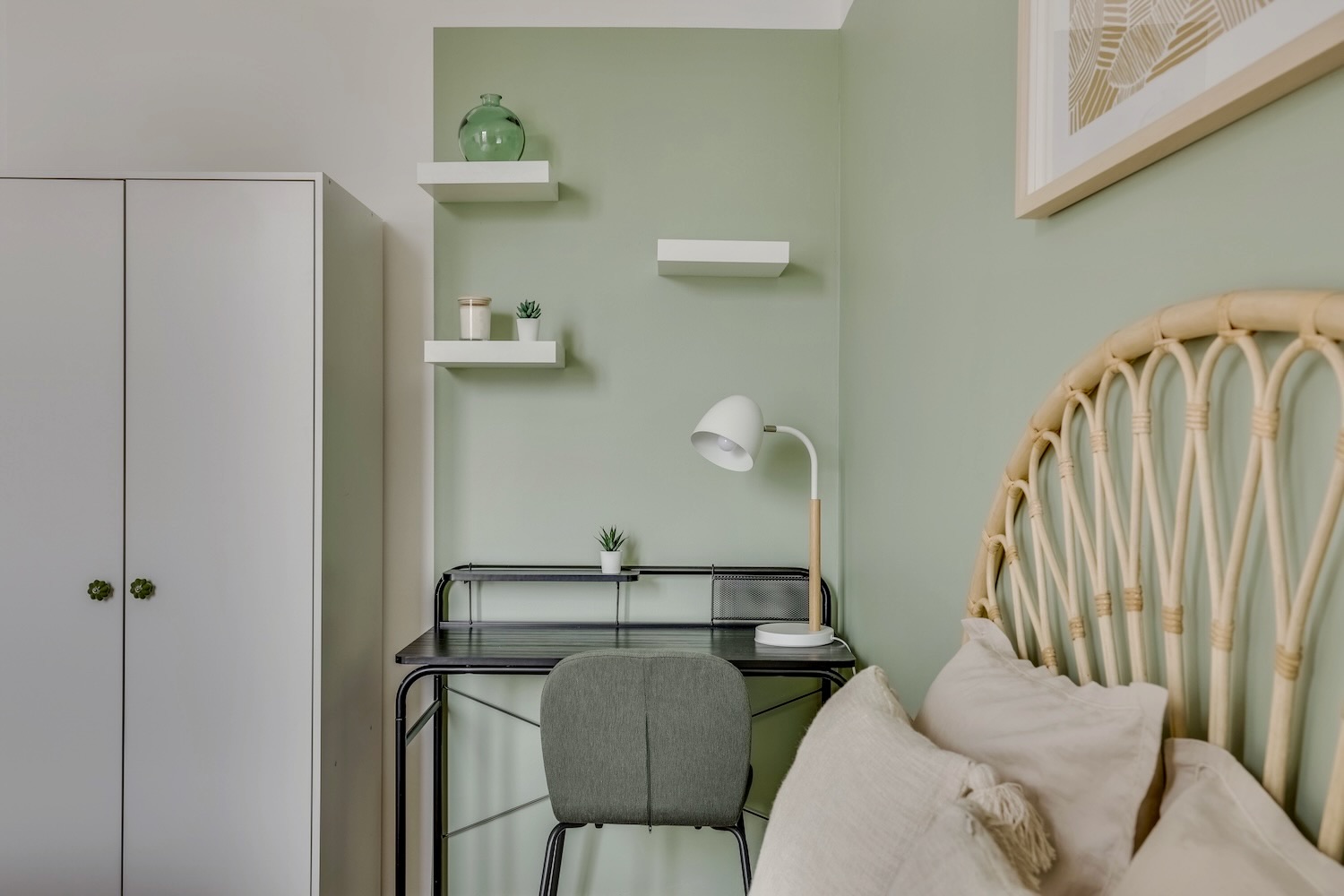 Make this 11 m² bedroom your new home! Located in Gentilly, bordering the south of Paris, this bright room features stylish green and wood accents. Offered fully furnished, it includes a sleeping area with a double bed (140x190), a dedicated workspace, and plenty of storage.