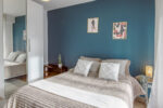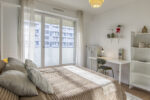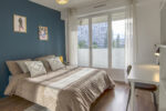 Large room of 15m², fully furnished. It has a double bed (140x190) accompanied by a bedside table with lamp and a large mirror at the head of the bed. A work area is included, composed of a desk with chair and lamp. The room also has storage space: a wardrobe with hanging space and a shelf. The room also has its access to the balcony.