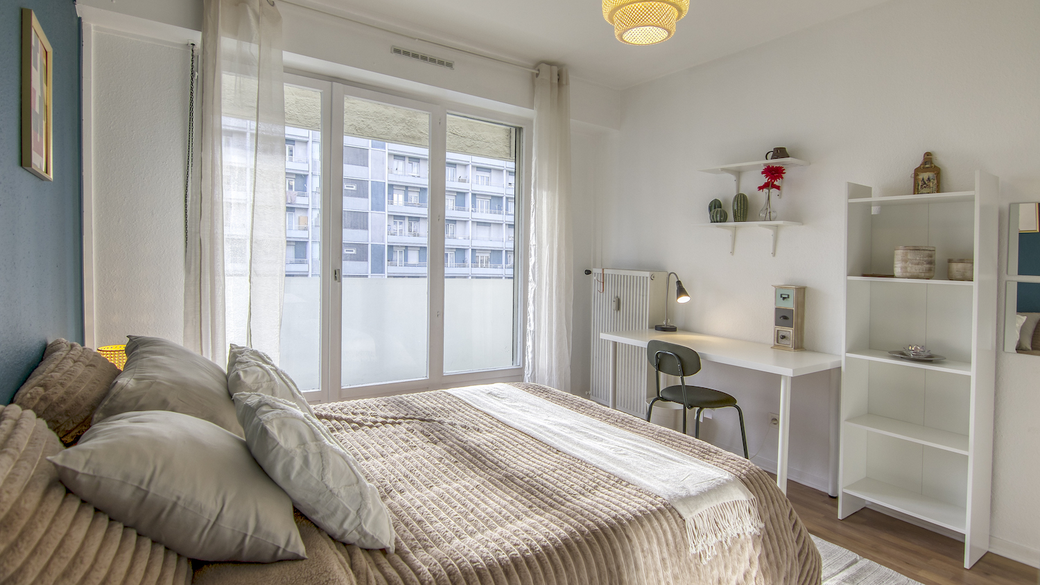 Large room of 15m², fully furnished. It has a double bed (140x190) accompanied by a bedside table with lamp and a large mirror at the head of the bed. A work area is included, composed of a desk with chair and lamp. The room also has storage space: a wardrobe with hanging space and a shelf. The room also has its access to the balcony.